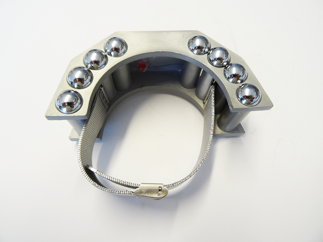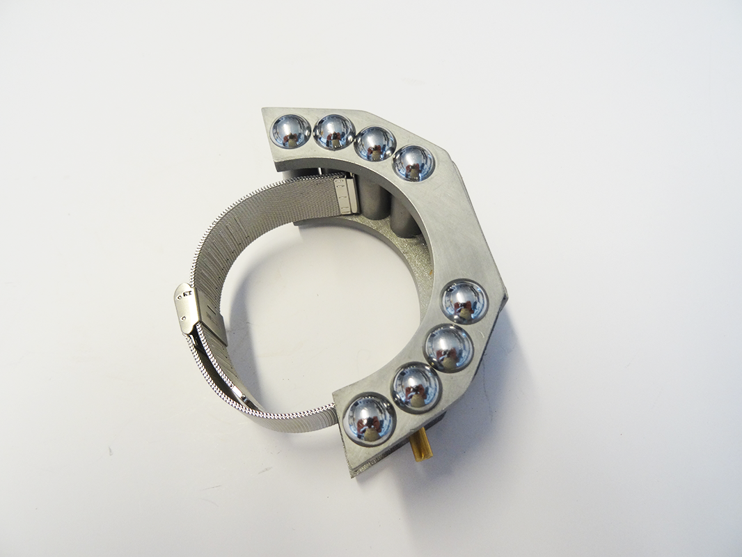 All cold cast aluminium construction with stainless steel mesh strap, steel pins, steel screws, stainless steel hemispheres, brass eyelets and brass rod.